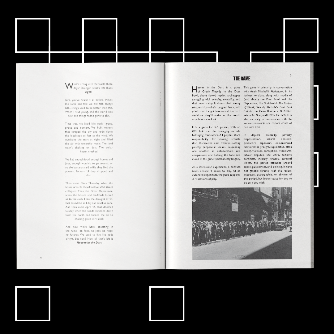 Heaven in the Dust is a game of Greek Tragedy in the American Dust Bowl for 3–5 players across 1–4 sessions, filled with lonely roads and crowded factories, looming storms and fragile shelter, desperate masses and choking dust.