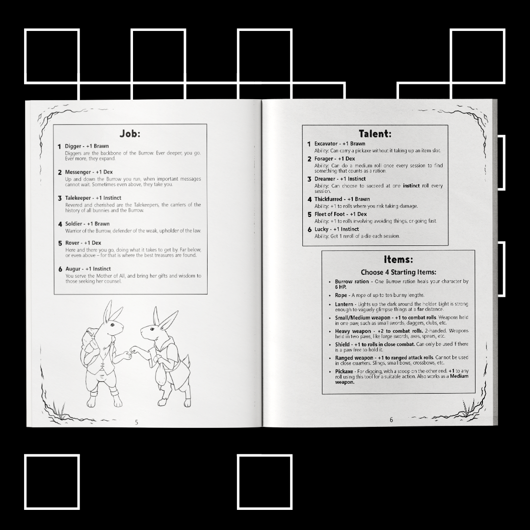 Burrow Tales is a rules-light table top role playing game by Lonnie T. Brandt, based on Nate Treme's Tunnel Goons. In Burrow Tales the players take on the roles of brave adventurer bunnies and Burrowardens, going underground into the vast networks below their kingdom. Create your bunny and go deeper, keeping your people safe from the dangers unearthed below. With just 2d6, 3 stats, and swift rules for combat and exploration, you're good to go!