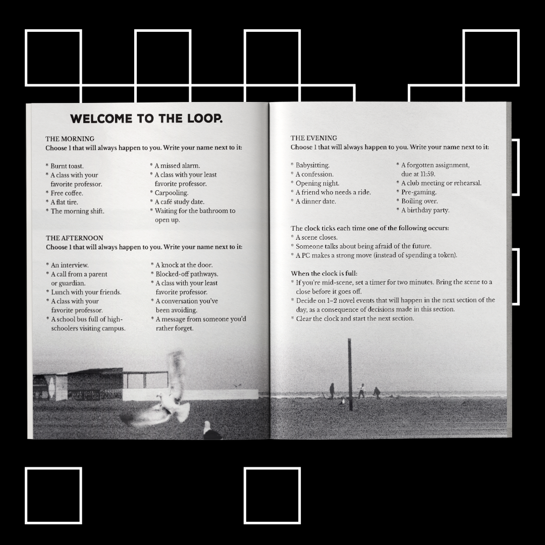 Begin Again is a GM-less tabletop roleplaying game for 3–5 players, built on the belonging outside belonging framework. All players share responsibility for the community that surrounds their characters, including causing problems for one another; framing and playing out scenes; giving each other the space to contribute to the story; and staying true to the tone and mood of your table’s Loop.