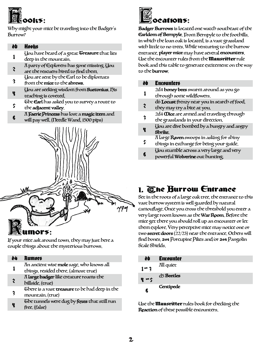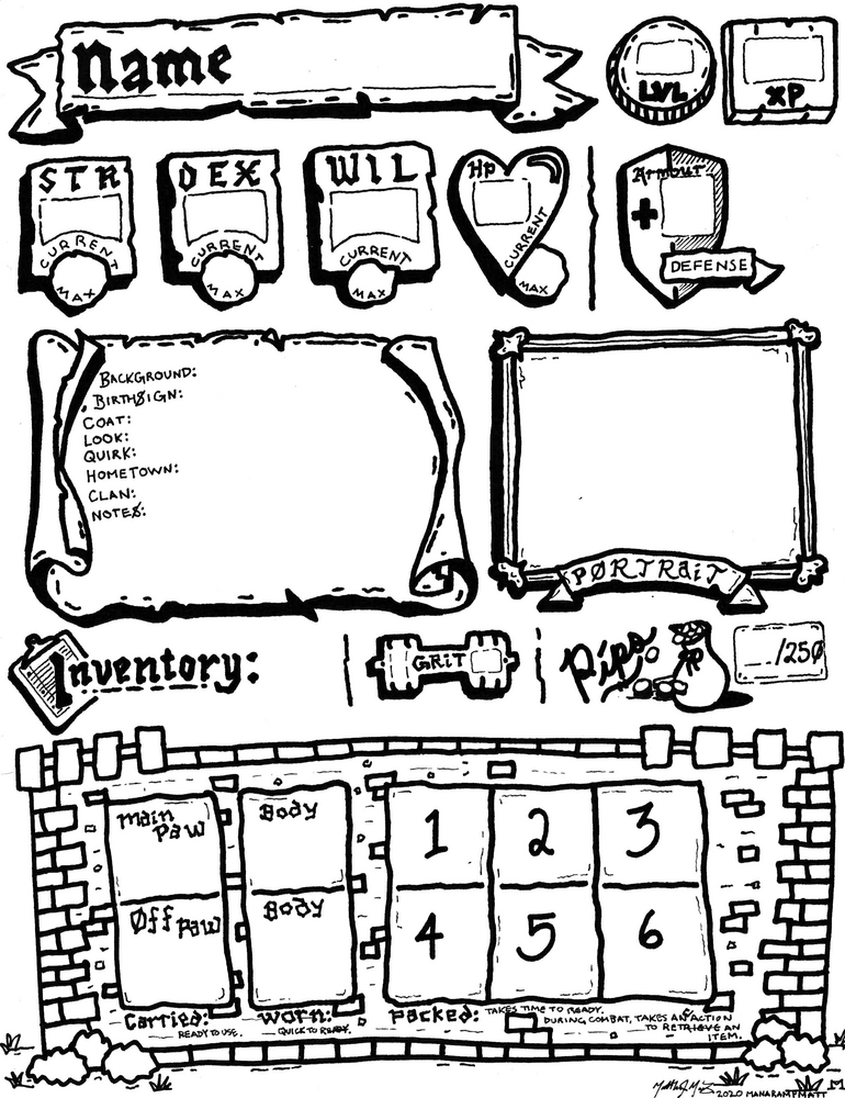 Bernpyle is an unofficial zine and supplement source for Mausritter and is compatible with the Mausritter gaming system . Mausritter Sword-and-Whiskers Role Playing Game is created by Isaac Williams. Mausritter is copyright Losing Games. Bernpyle is an independent production by ManaRampMatt and is not affiliated with Losing Games. It is published under the Mausritter Third Party License.