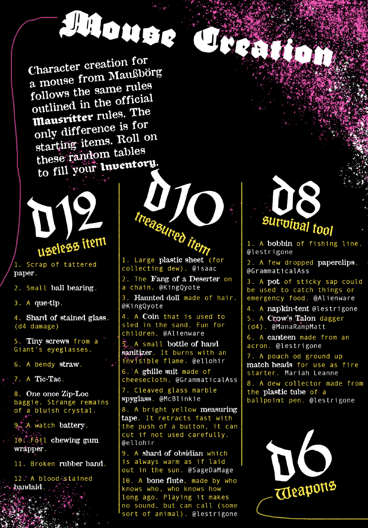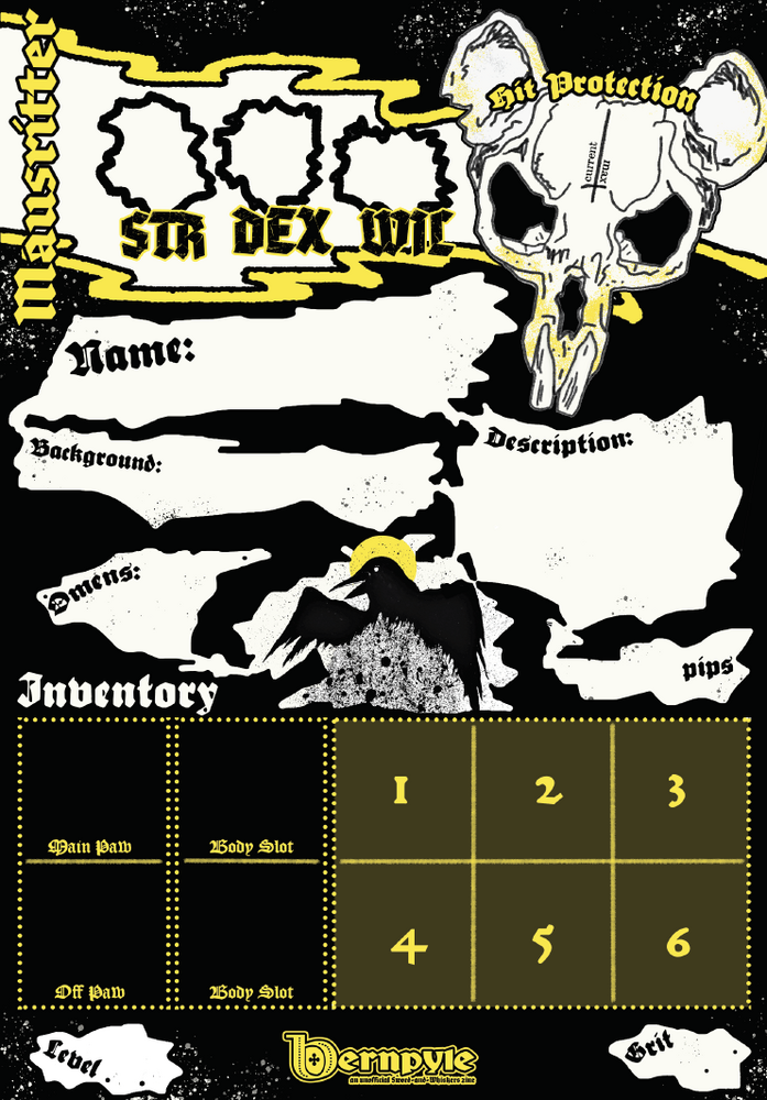 Bernpyle is an unofficial zine and supplement source for Mausritter and is compatible with the Mausritter gaming system. Mausritter Sword-and-Whiskers Role Playing Game is created by Isaac Williams. Mausritter is copyright Losing Games. Bernpyle is an independent production by ManaRampMatt and is not affiliated with Losing Games. It is published under the Mausritter Third Party License.