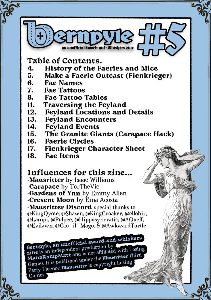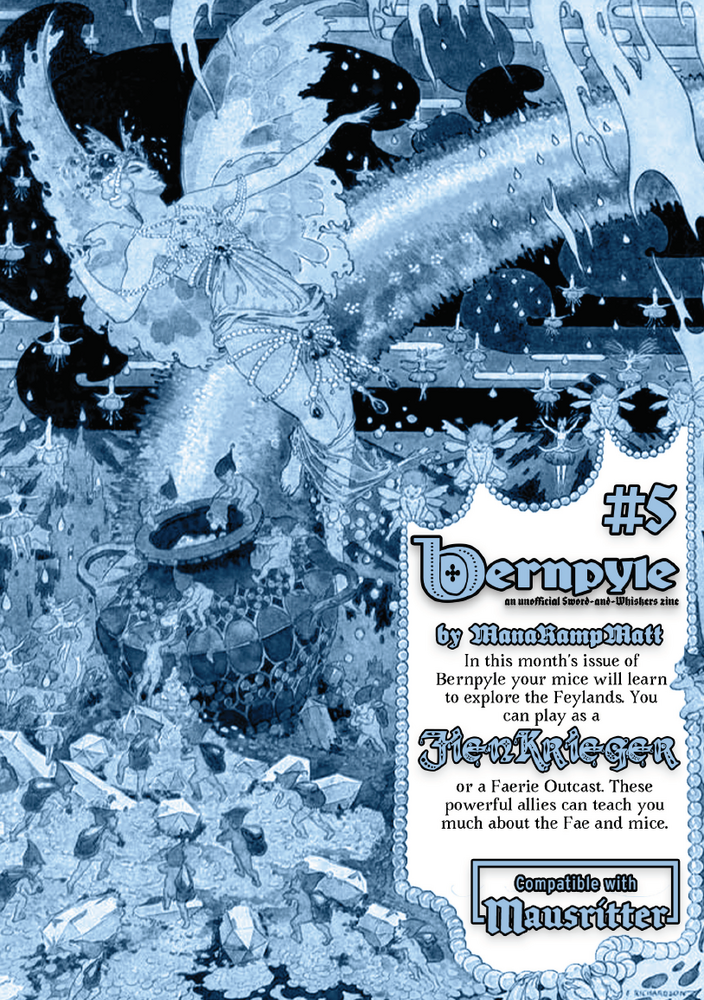 Bernpyle #5 is an unofficial Mausritter zine, and it is packed full of fun content. This zine features a hack of Emmy Allen's amazing Gardens of Ynn. It also contains a hack of TorTheVic's Carapace. Bernpyle #5 feature loads of public domain faerie art and has been a pet project of mine. I am excited to release this fun and magical addition to your Mausritter campaign. Learn the history of the Maus and Fae conflicts. Play as a Faerie Outcast, a Fienkrieger. Explore the vast unknown of the Feylands.