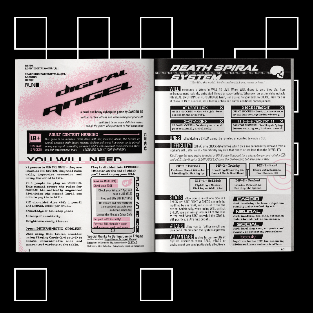 Digital Angel is intended to be brutal, brief and immensely extra spiritual successor to the free trifold pamphlet game Burnout Reaper. The revamped DEATH SPIRAL SYSTEM uses a d6 Pool as the players' slowly dwindling WILL, with each 1 meaning another WILL lost.