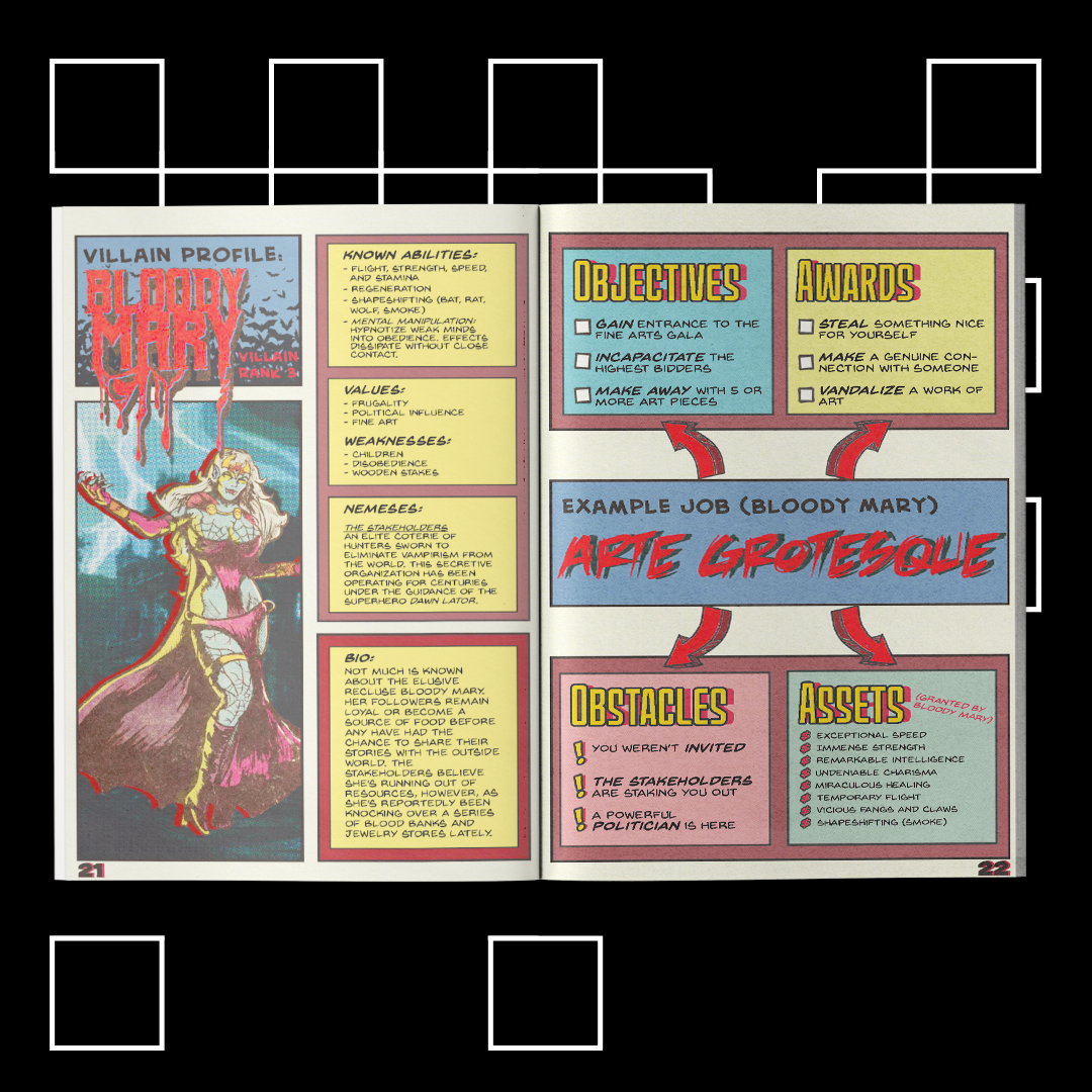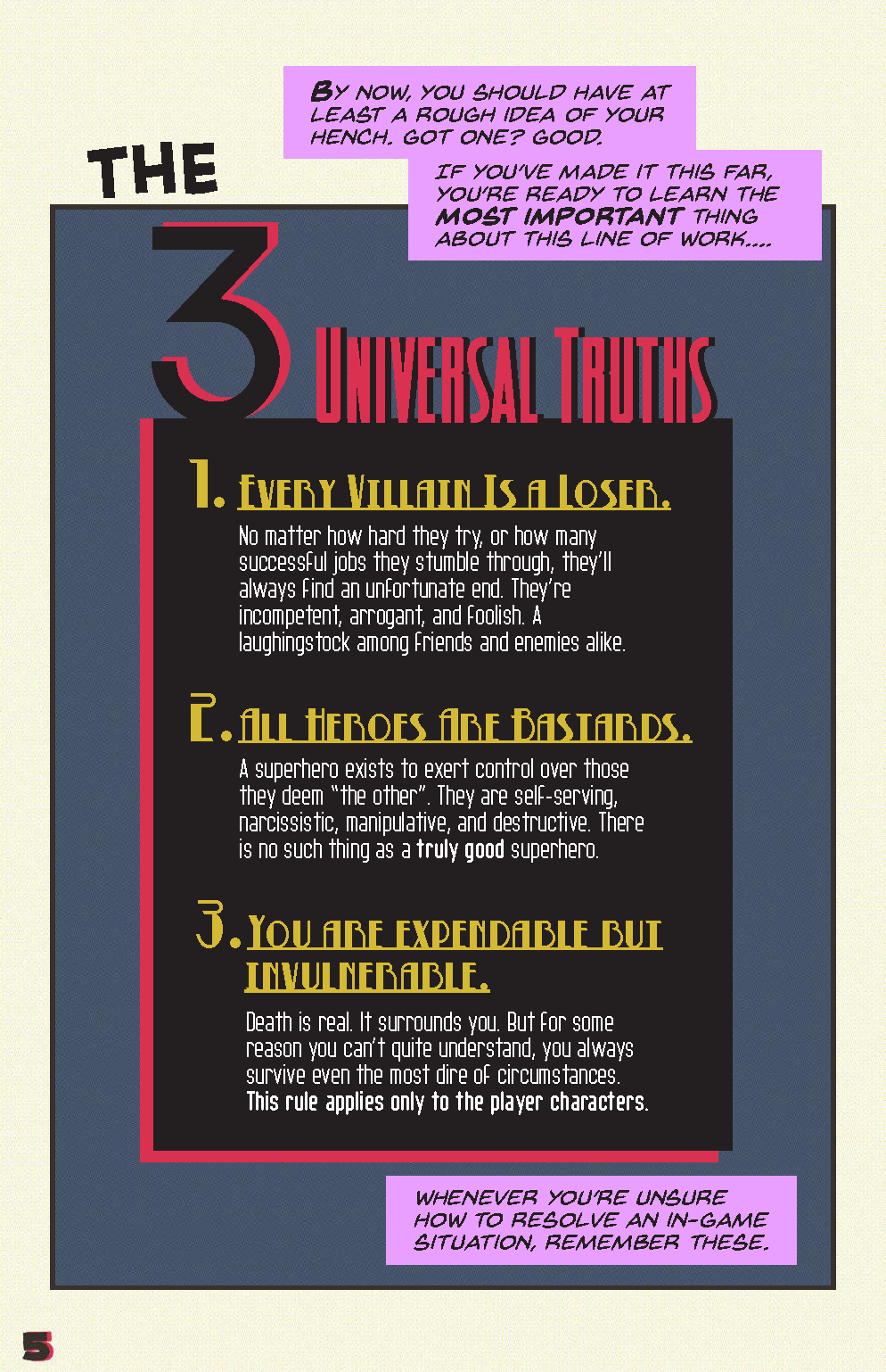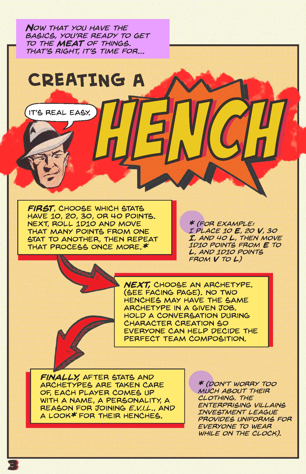 In this GM-optional ttrpg, you play the true stars of every superhero story; the Henches. You and your fellow players landed your first gig with the Enterprising Villains Investment League and have been assigned to work for an up-and-coming villain. Follow their orders, take on thrilling heists, concoct nefarious plots, and complain about what a loser they are as you claw your way up the ranks in pursuit of bigger and better paydays.