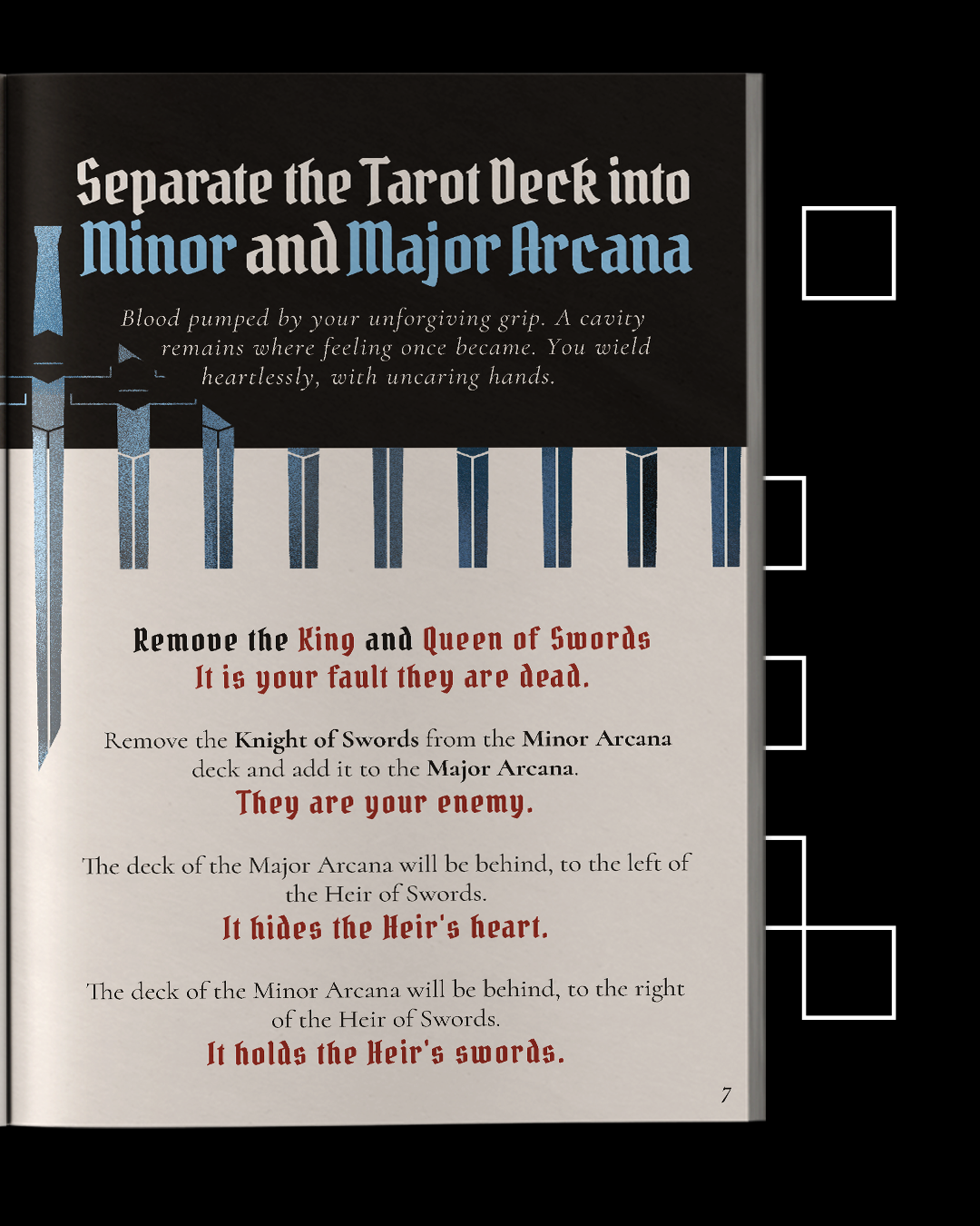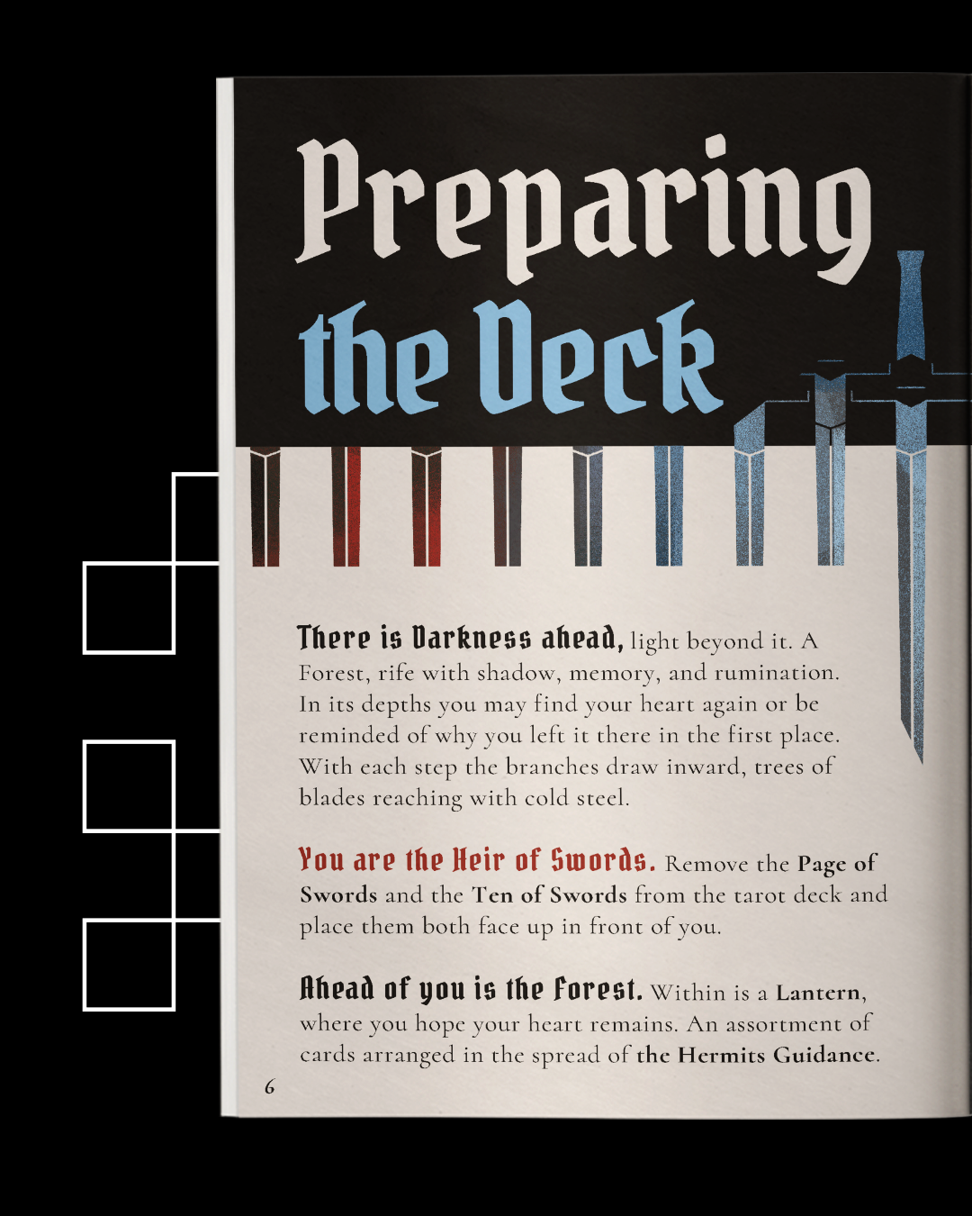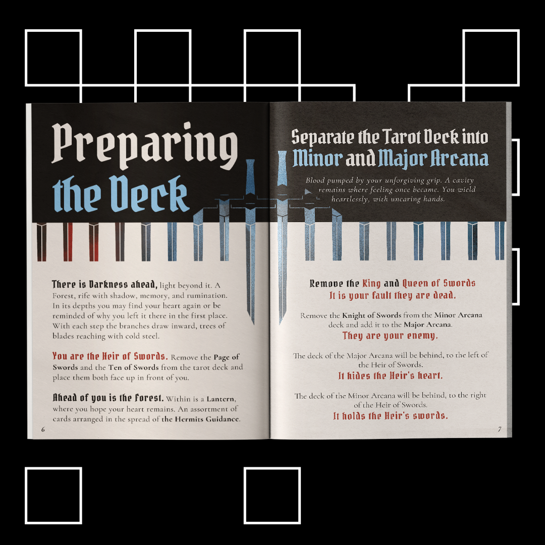 Heir of Swords is a tarot-based solo divination and journaling TTRPG where you divine the fate of the Heir of Swords through a tarot spread. Navigate the spread of the Forest as the Heir, searching for their Heart and the treacherous Knight of Swords.